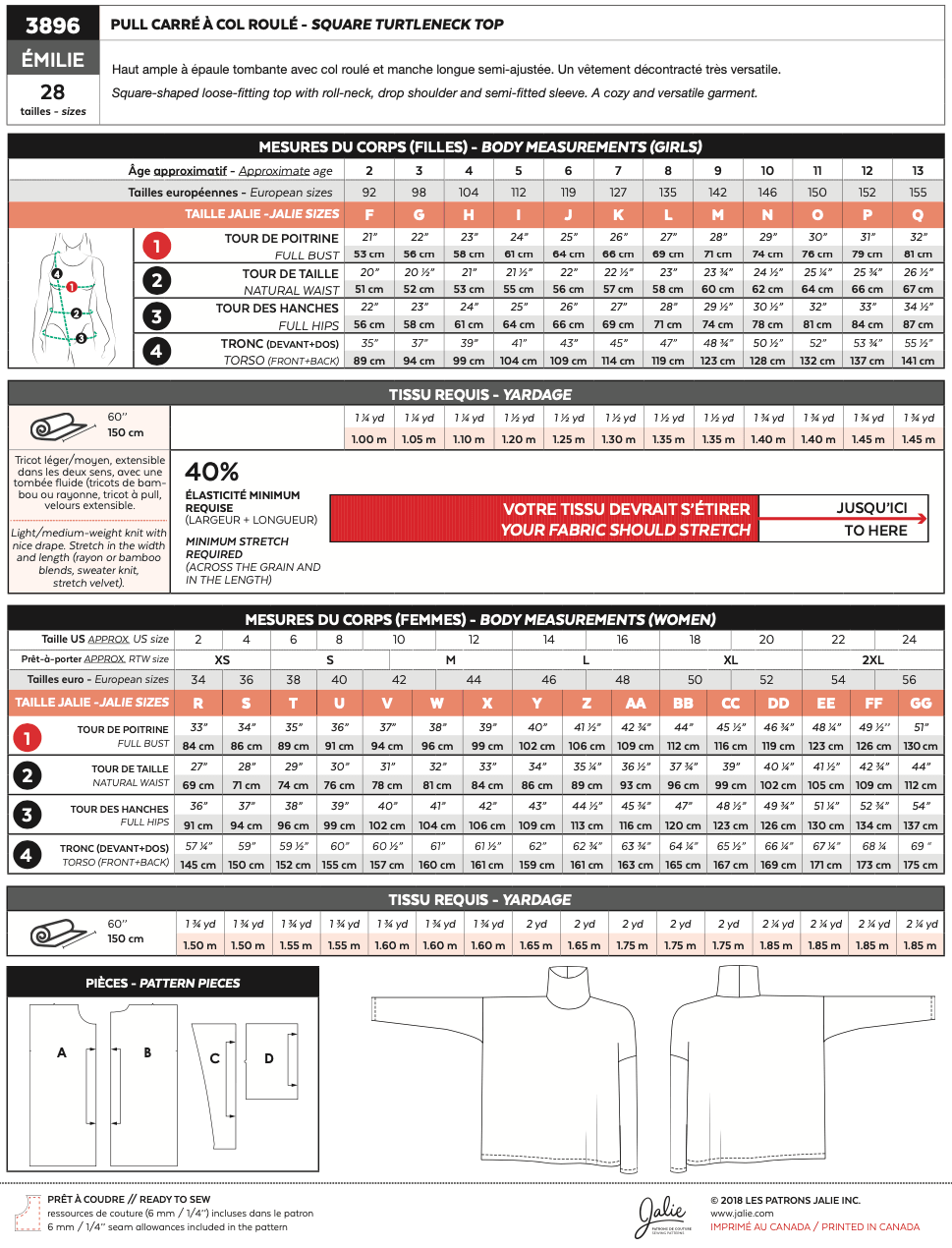 Émilie is a free pattern for a square-shaped loose-fitting top with a roll-neck, drop shoulder, and semi-fitted sleeve. You can easily turn it into a tunic or dress by adding length at the hem and wearing them with our popular Clara leggings.