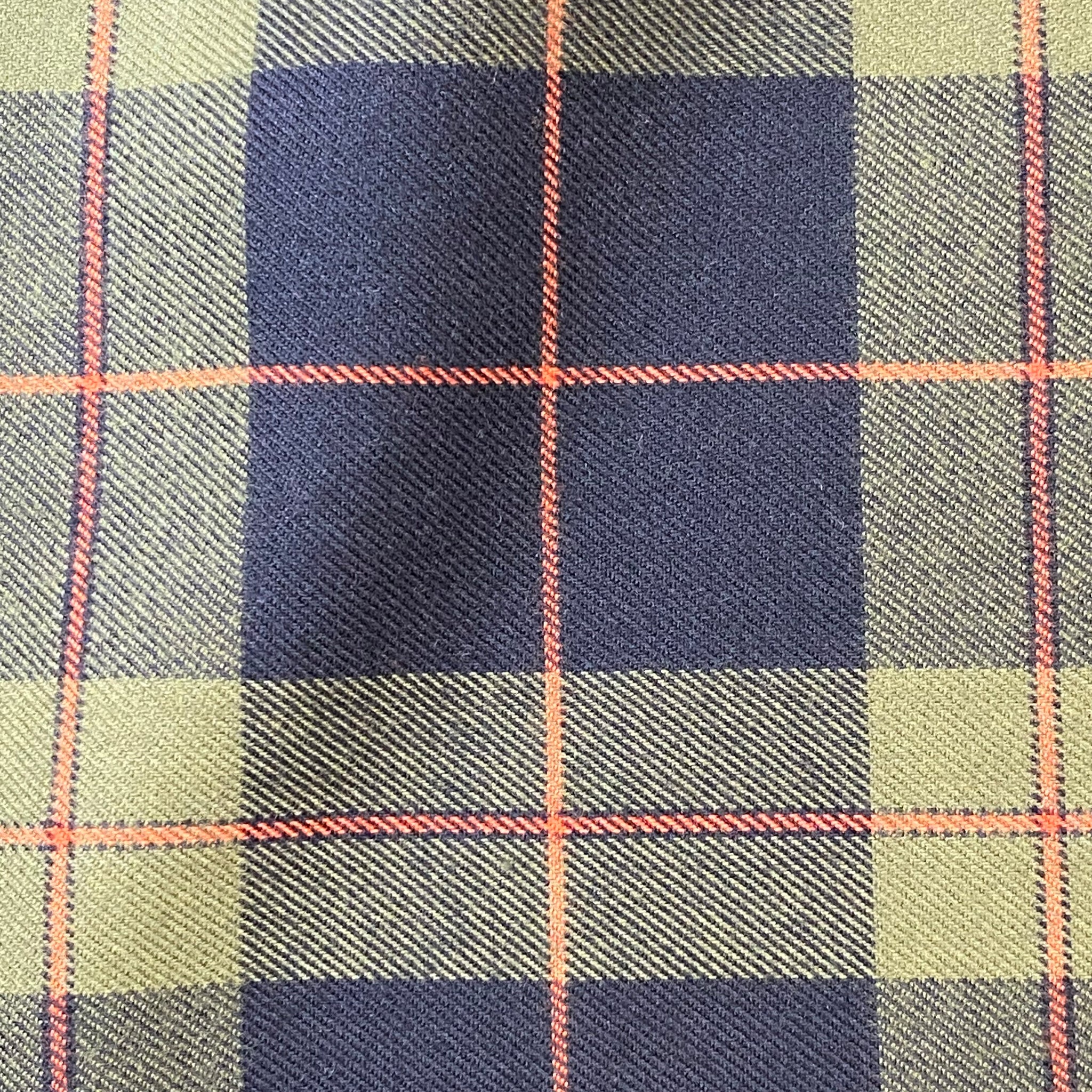 Soft and cozy poly-cotton blend flannel in a classic plaid pattern of orange stripes over khaki green background. This medium weight fabric combines the durability and easy care of polyester with the breathability and comfort of cotton.