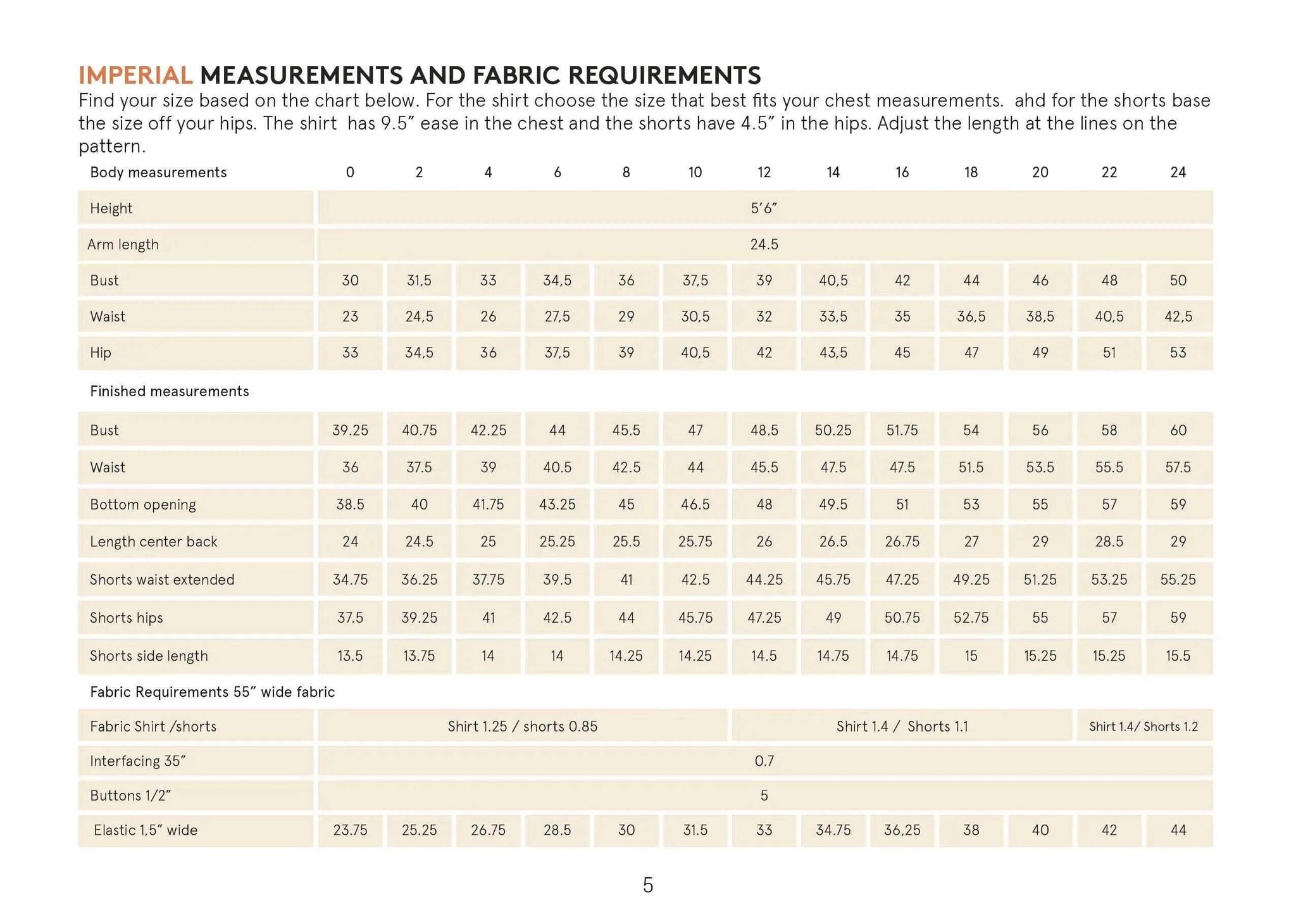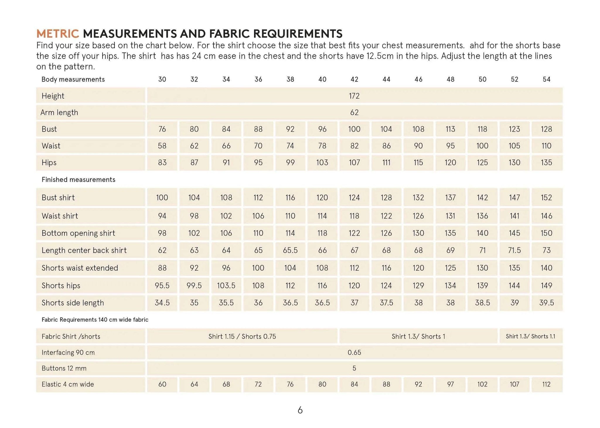 Flip through the images to find fabric requirements and measurements for the shorts and Camp Shirt sewing pattern.