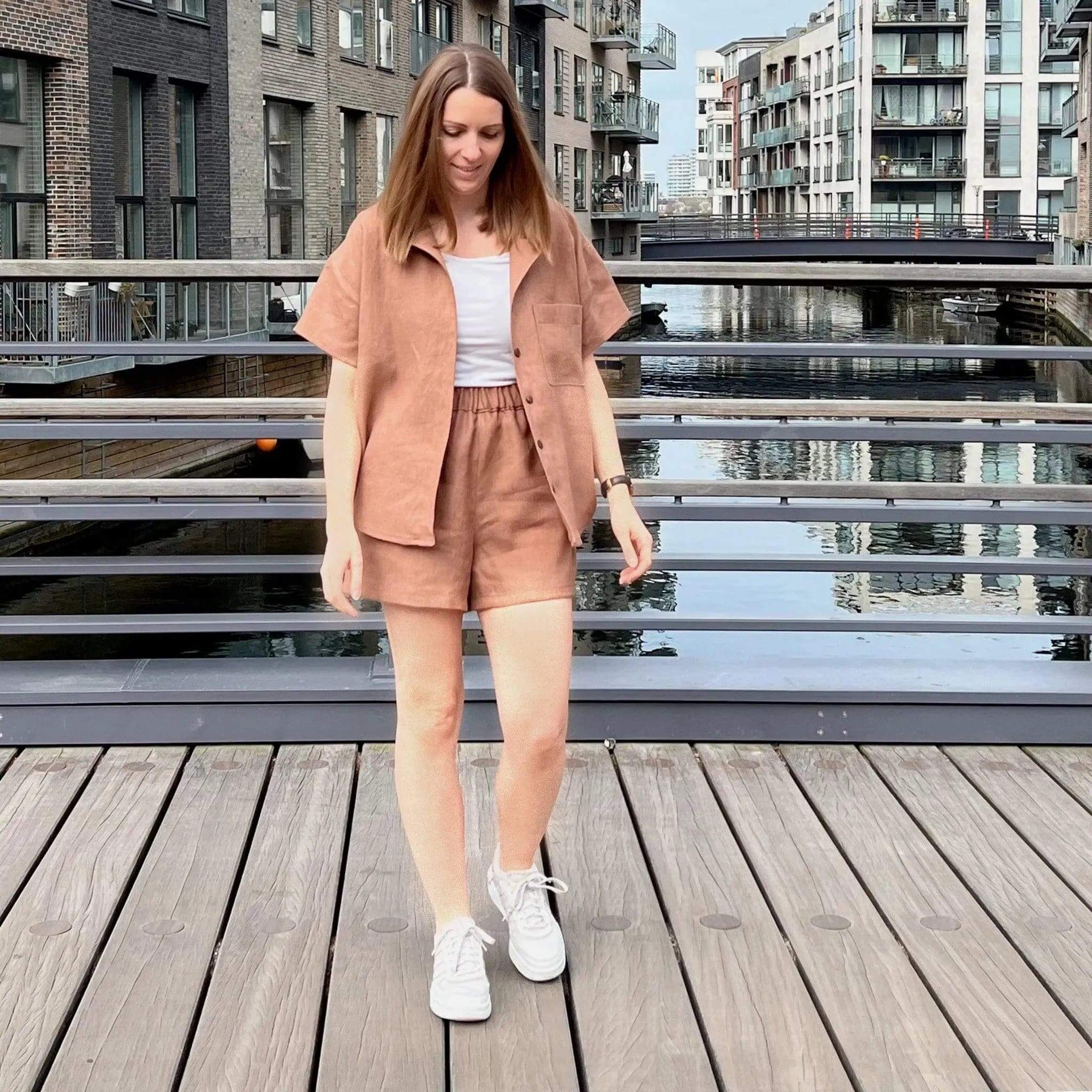 Camp Shirt Sewing Pattern is a relaxed, button-up shirt with a convertible collar, short sleeves, and a comfortable, oversized fit — perfect for casual wear. The shorts are simple and roomy, with an elasticated waistline. Make the Camp Shirt Sewing pattern with woven linen, cotton, silk, or viscose fabric. Lounge around the house, wear the set with sneakers, and head to the beach. This is a PDF sewing pattern.