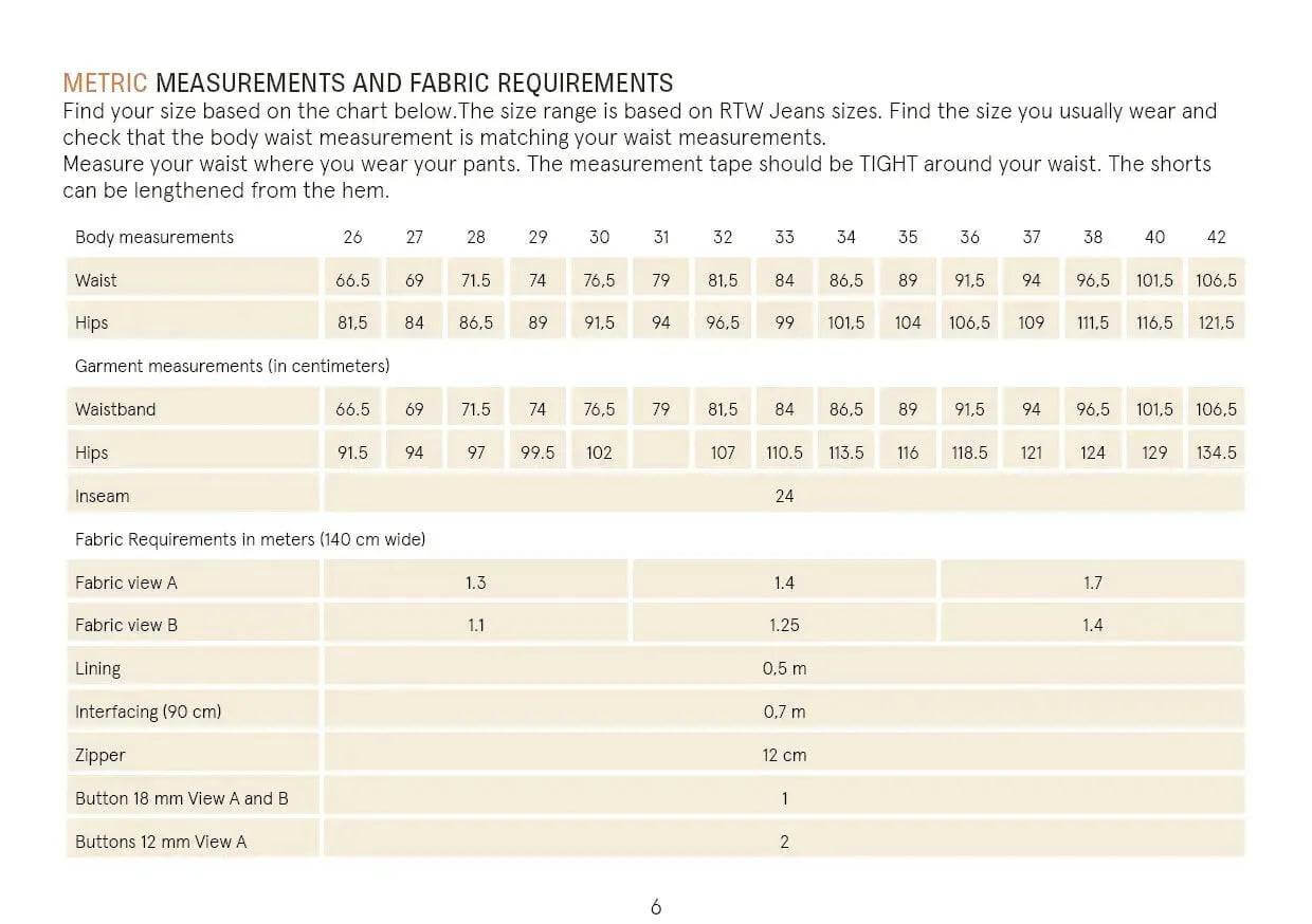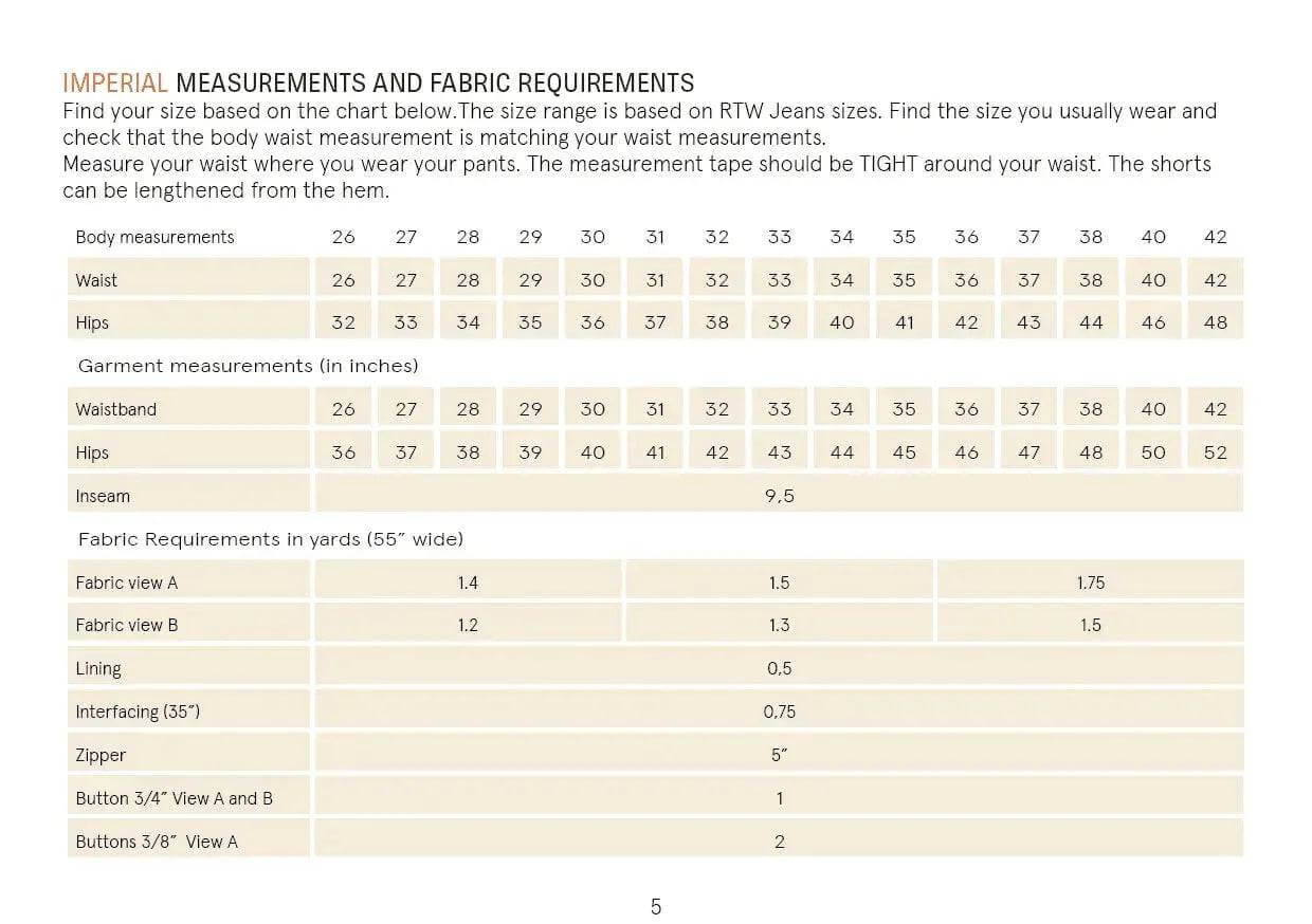 Flip through the images to find fabric requirements and measurements for the Cargo Shorts sewing pattern