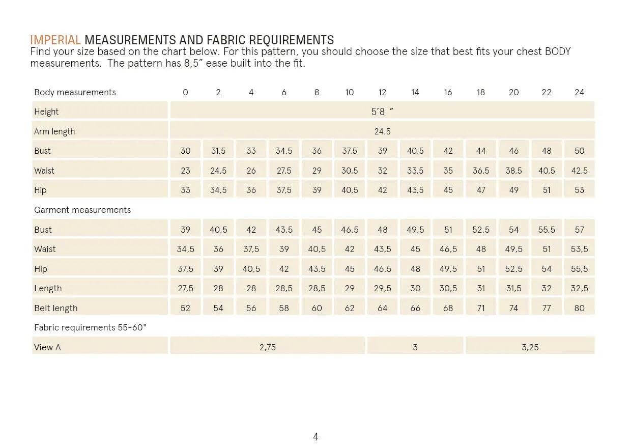 Flip through the images to find fabric requirements and measurements for the Jacket Sewing Pattern.