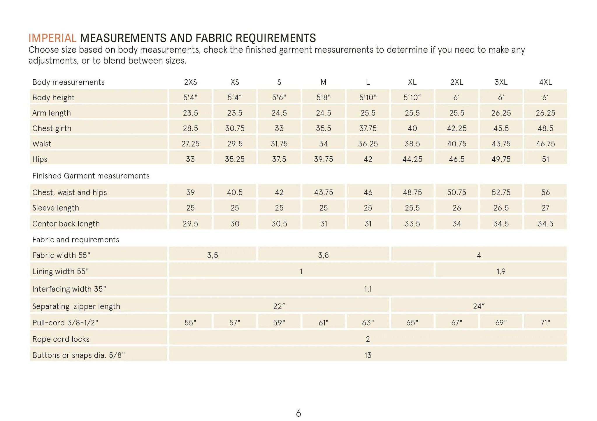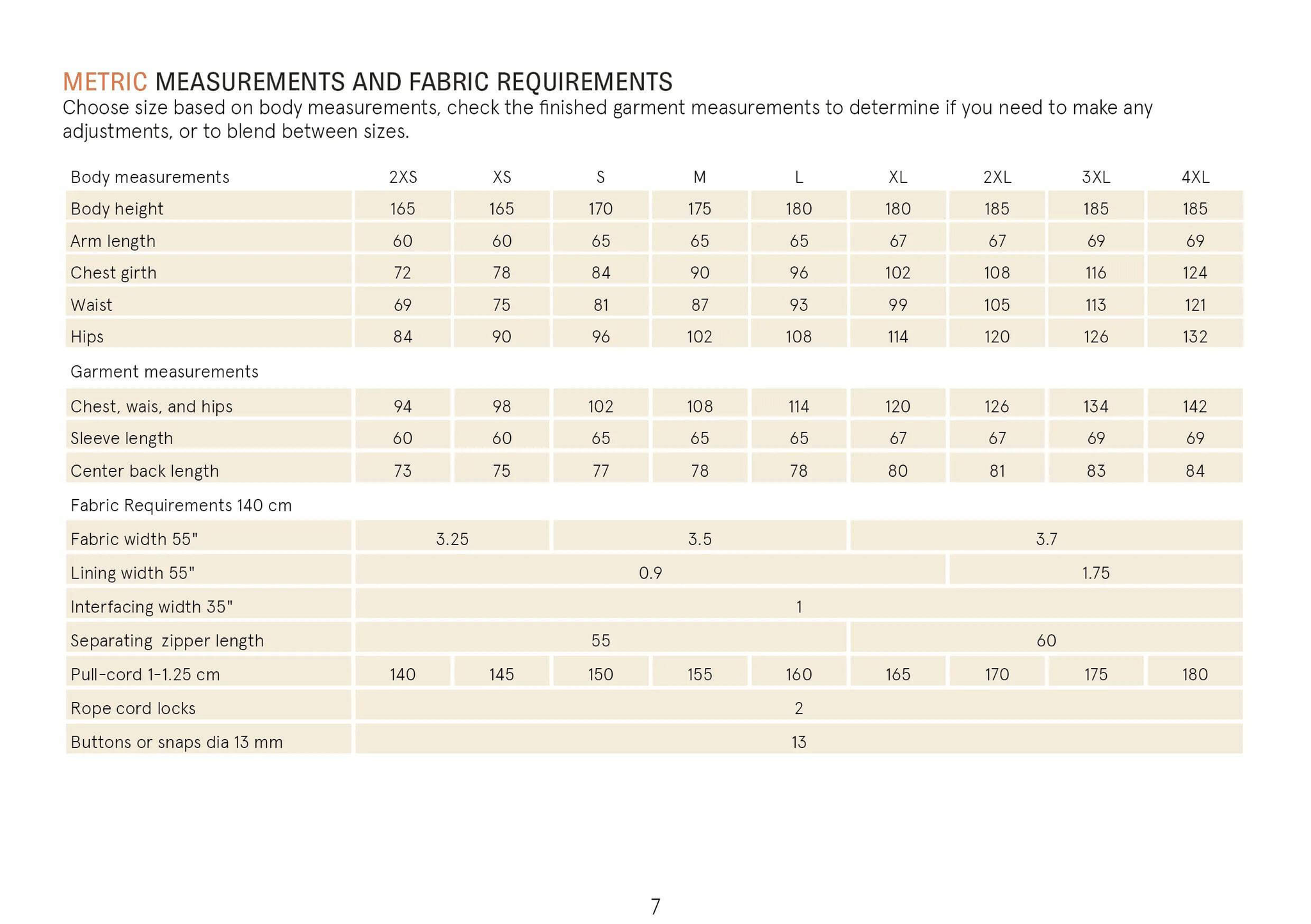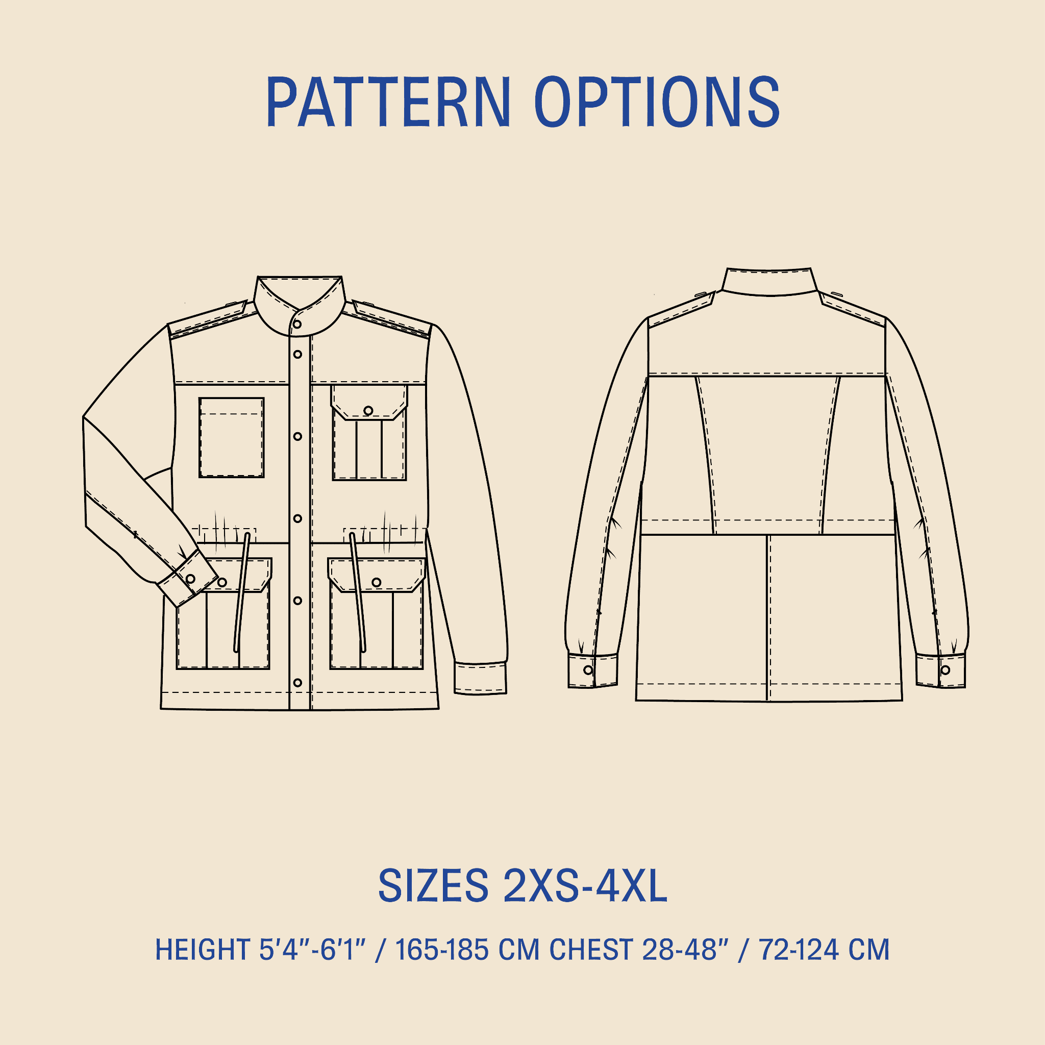Flip through the images to find fabric requirements and measurements for the Utility jacket sewing pattern