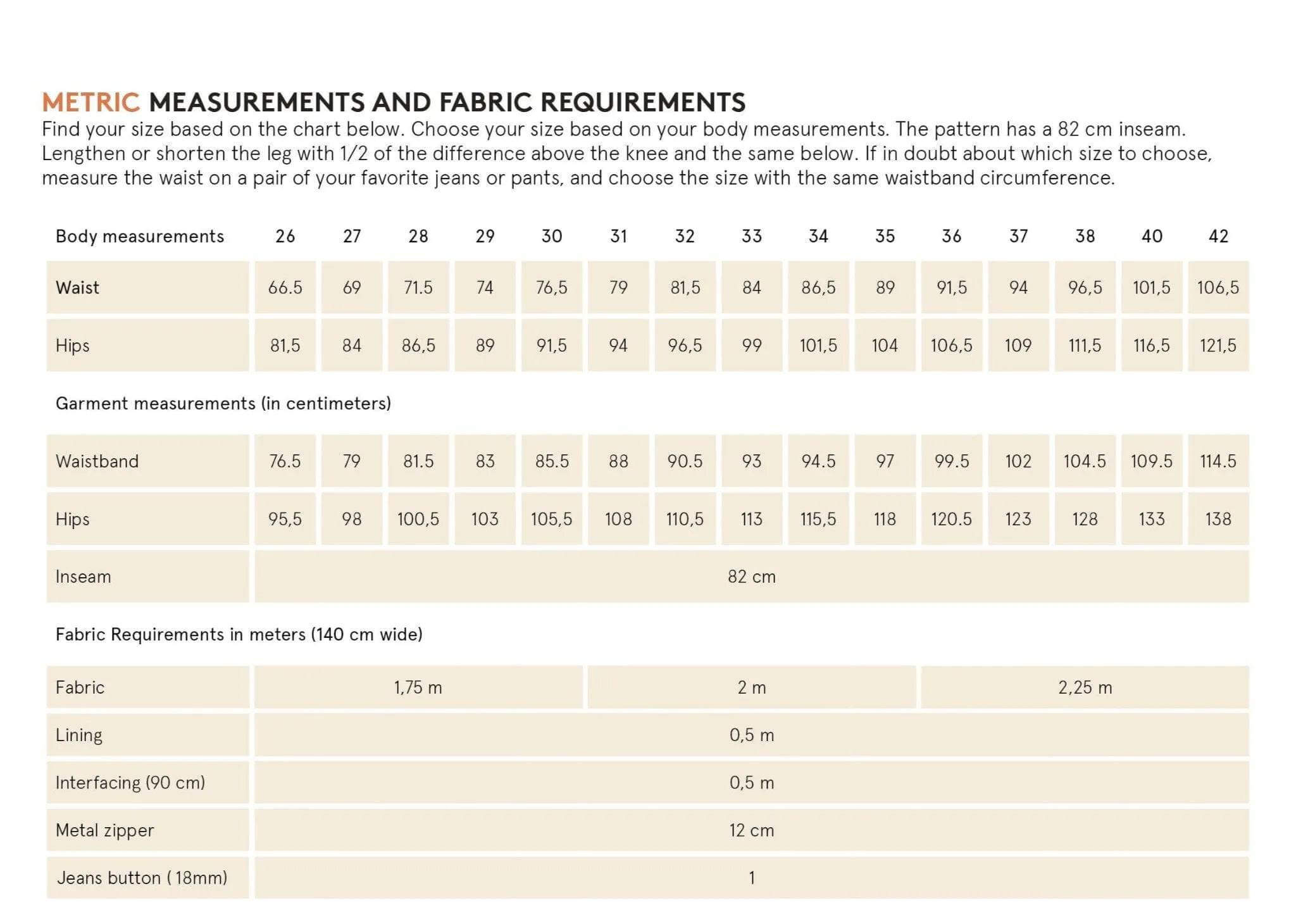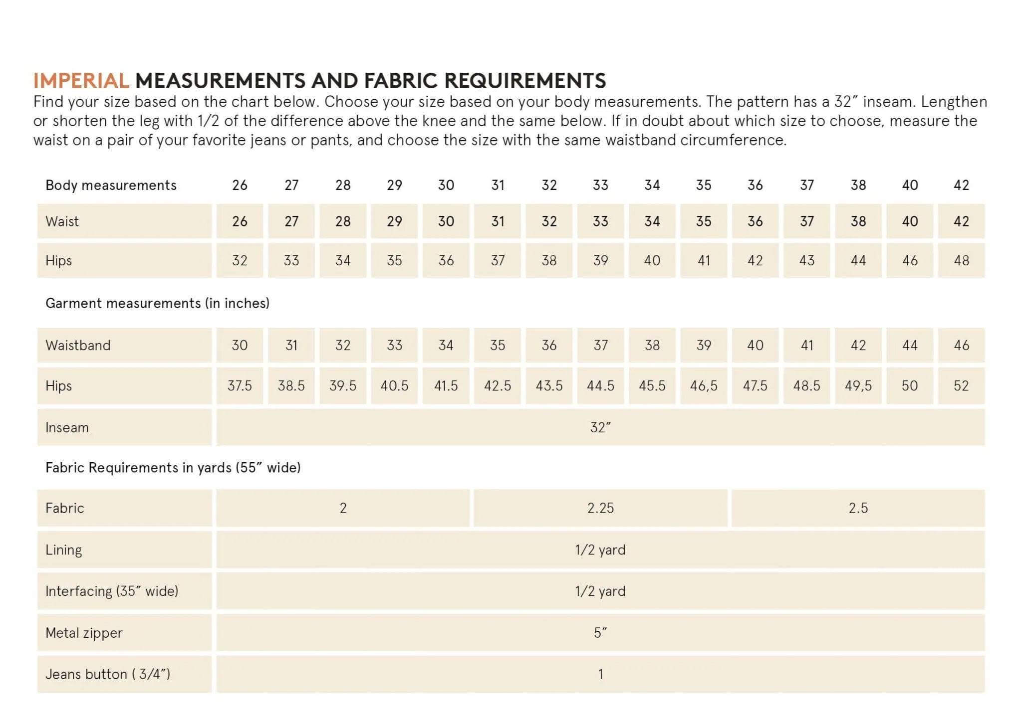 Flip through the images to find fabric requirements and measurements of the Wilderness pants sewing pattern.