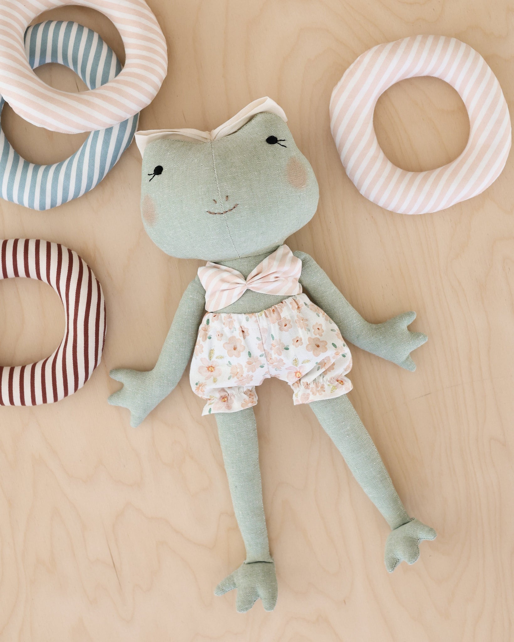 Make your own Mes petites lunes frog doll with this easy step-by-step tutorial and professional sewing pattern. With this bundle, you'll be able to craft an adorable 14-inch (35 cm) frog plush complete with sunny-day essentials: a pair of swim shorts (with two options—regular or ruffled), a bikini top, and a playful float ring that comes in two styles—classic or duck-faced.