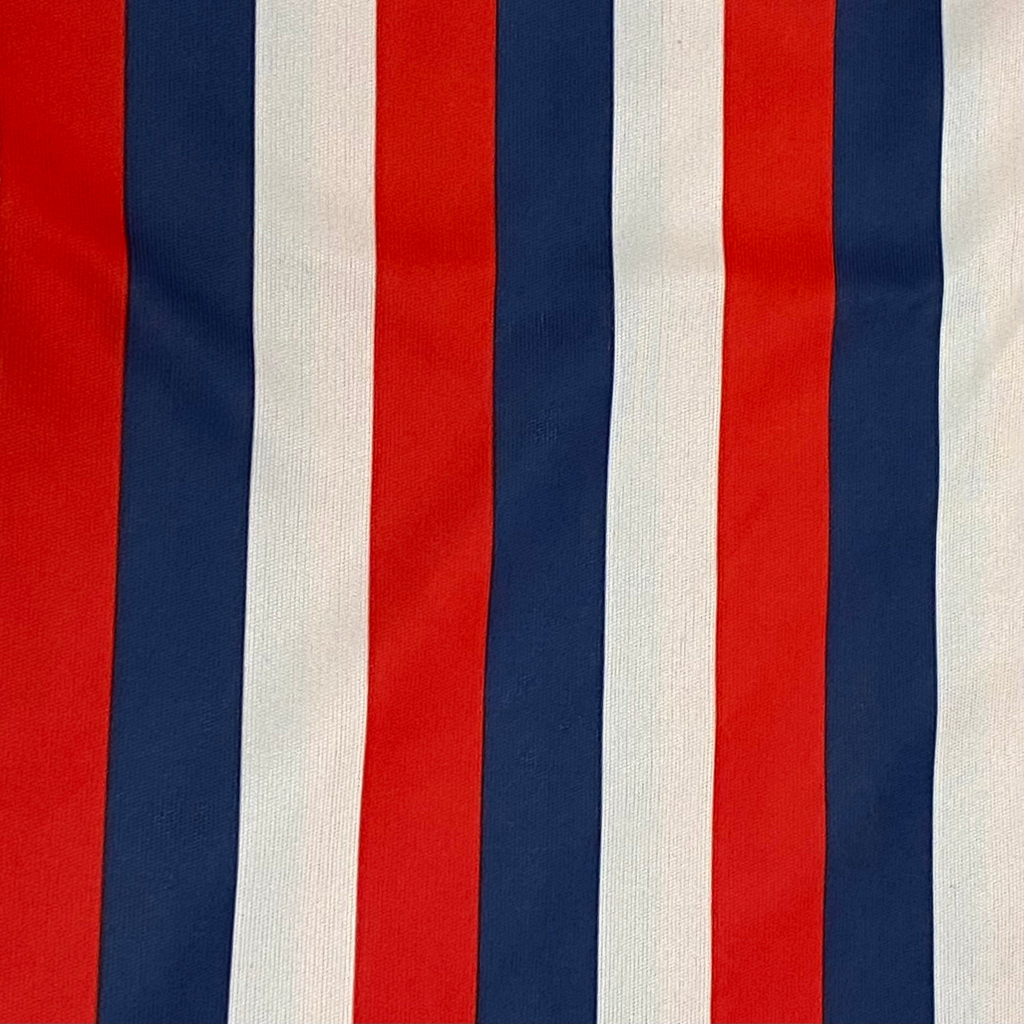 Synthetic knit fabric with bold red, blue and white stripes.