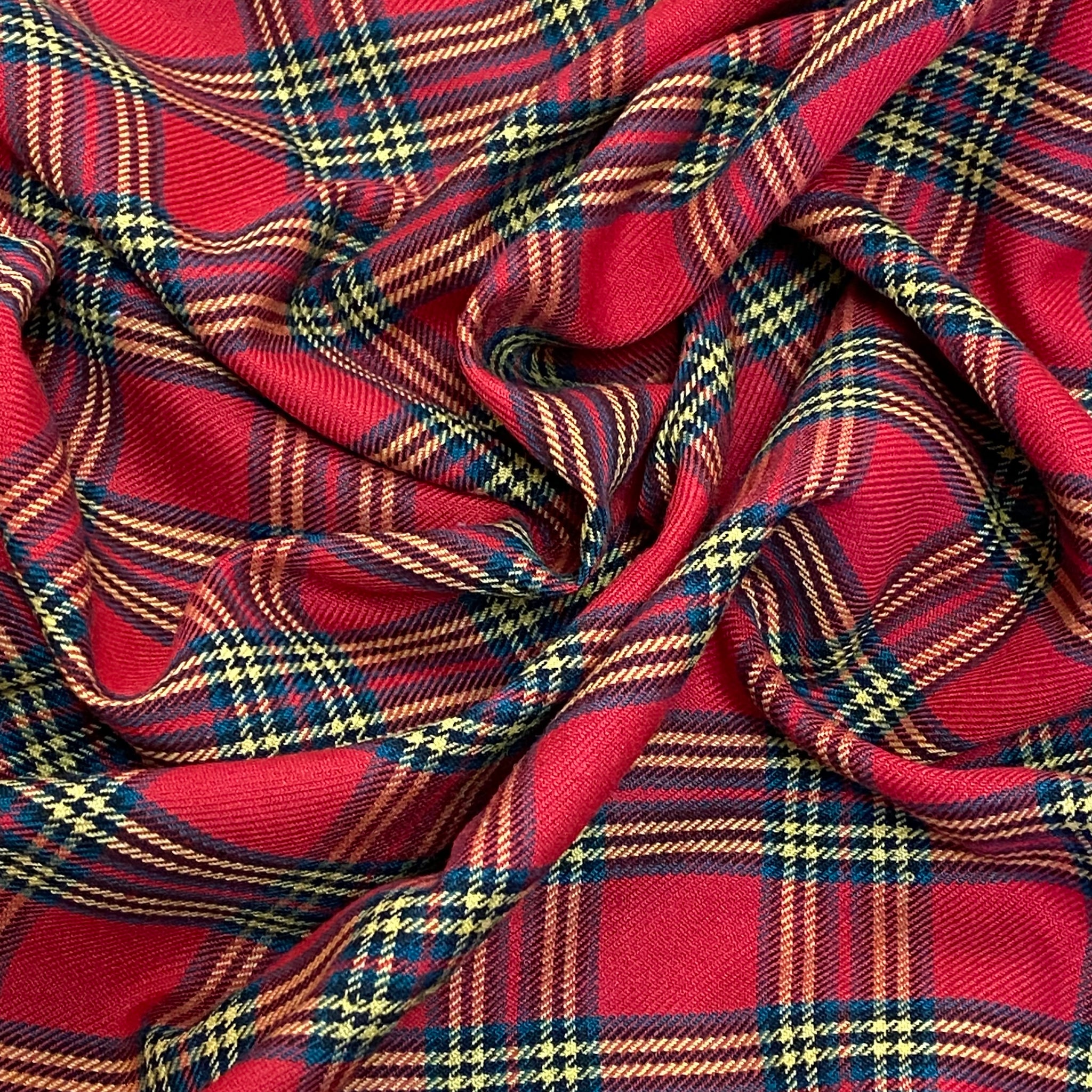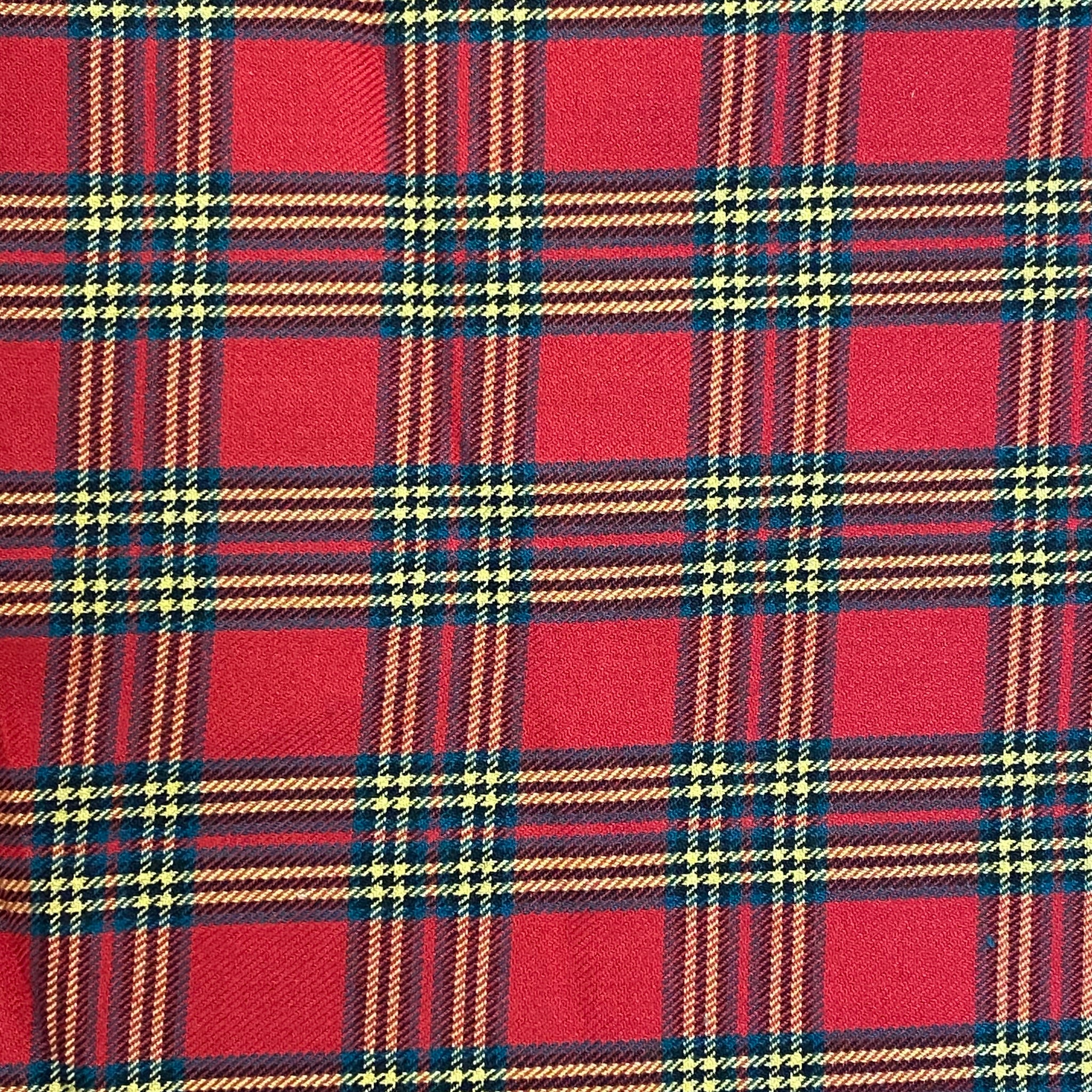 This fabric is a classic red background with navy, green and yellow checks. Medium-weight woven fabric with a subtle twill texture.