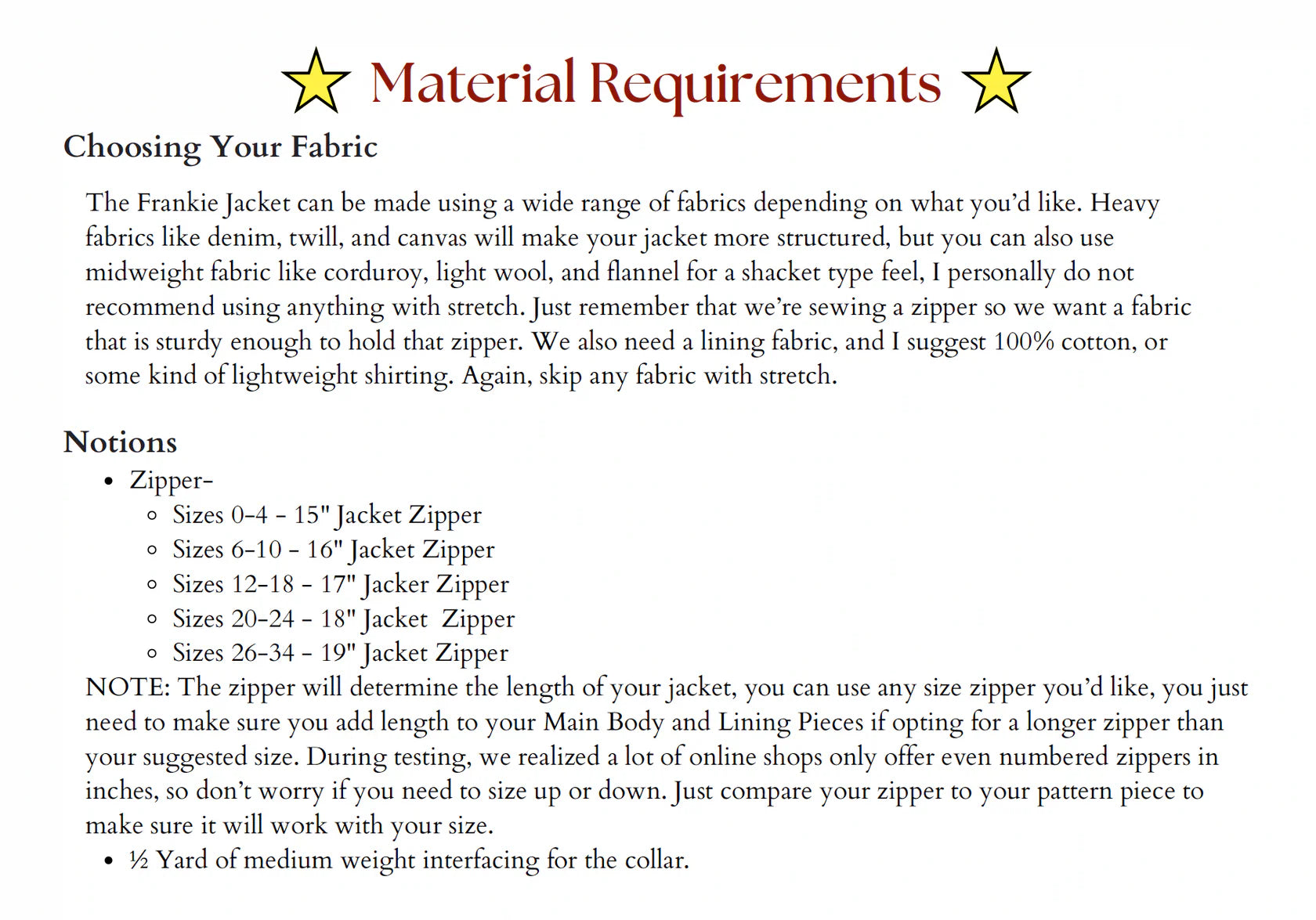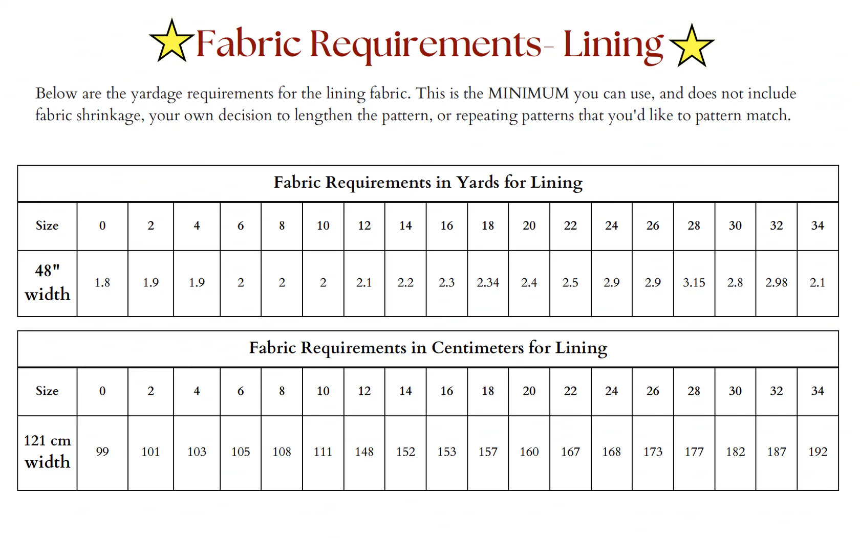 See Photos for Fabric Requirements and Size Guide