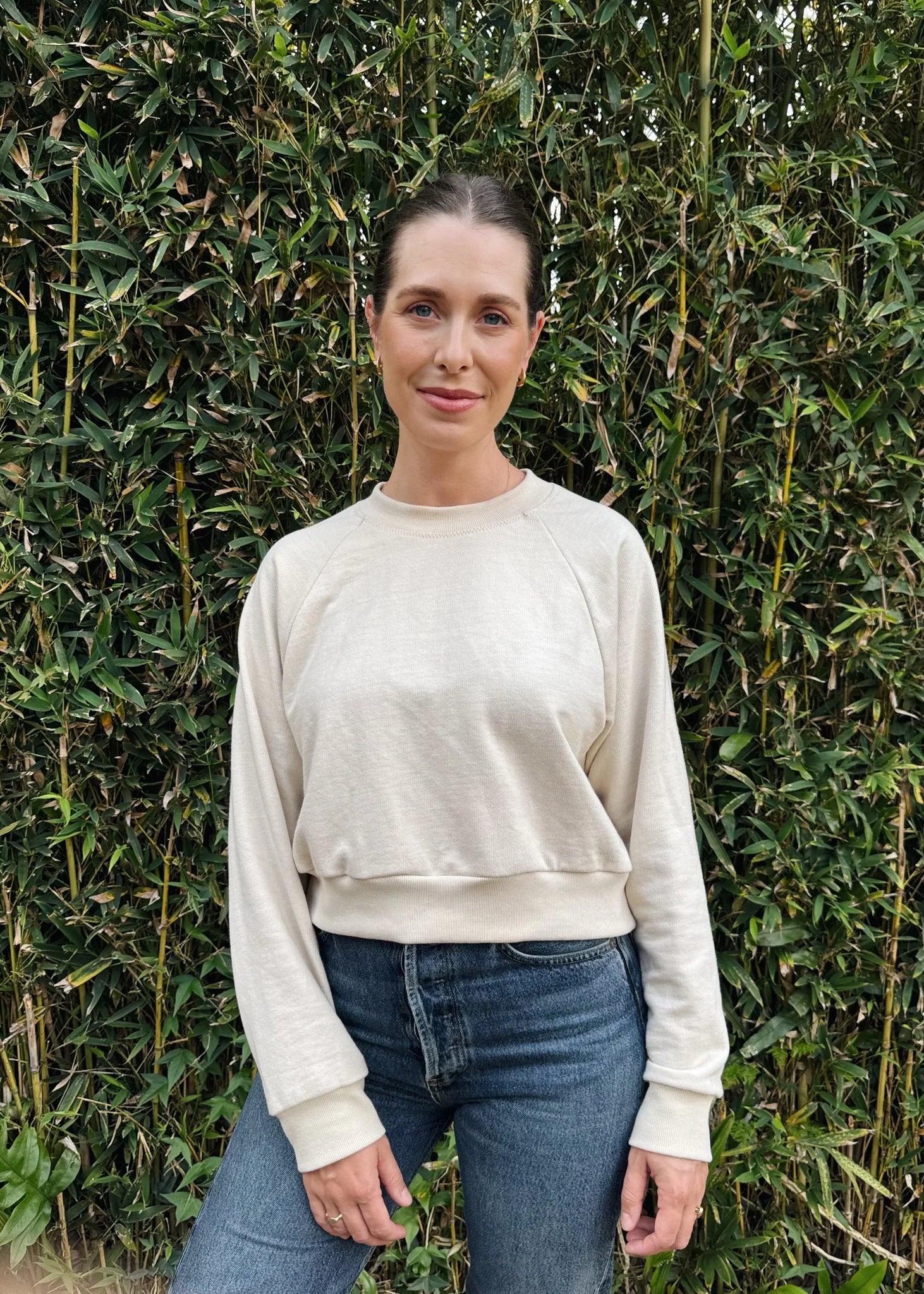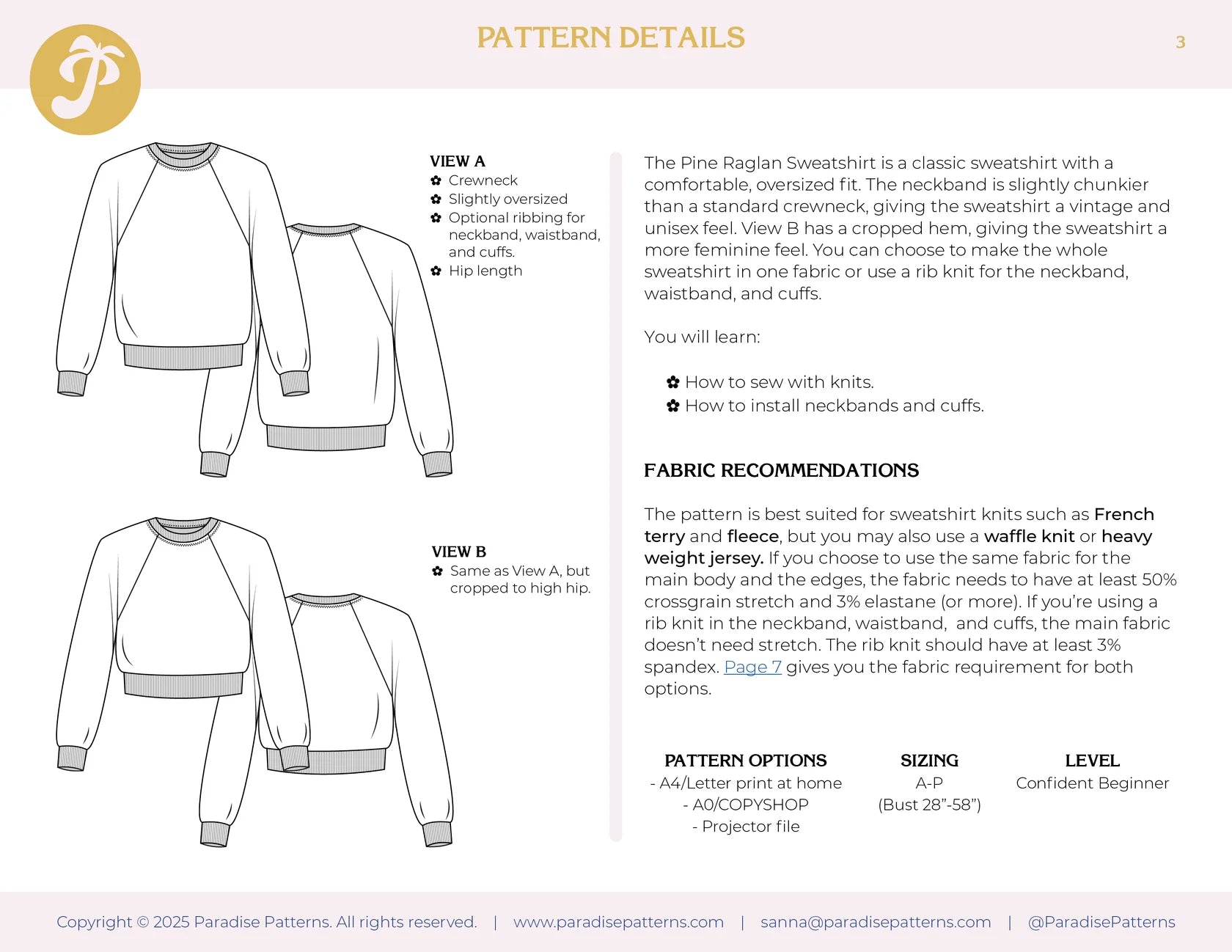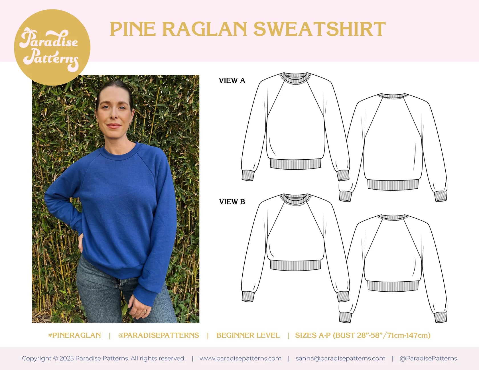 The Pine Raglan Sweatshirt is a classic sweatshirt with a comfortable, oversized fit. The neckband is slightly chunkier than a standard crewneck, giving the sweatshirt a vintage and unisex feel. View B has a cropped hem, giving the sweatshirt a more feminine feel. You can choose to make the whole sweatshirt in one fabric or use a rib knit for the neckband, waistband, and cuffs.