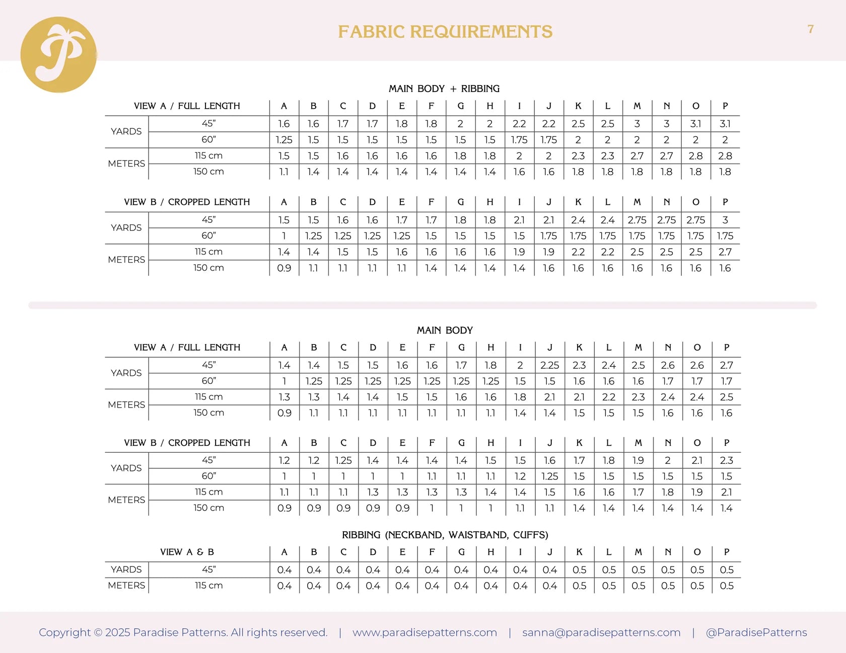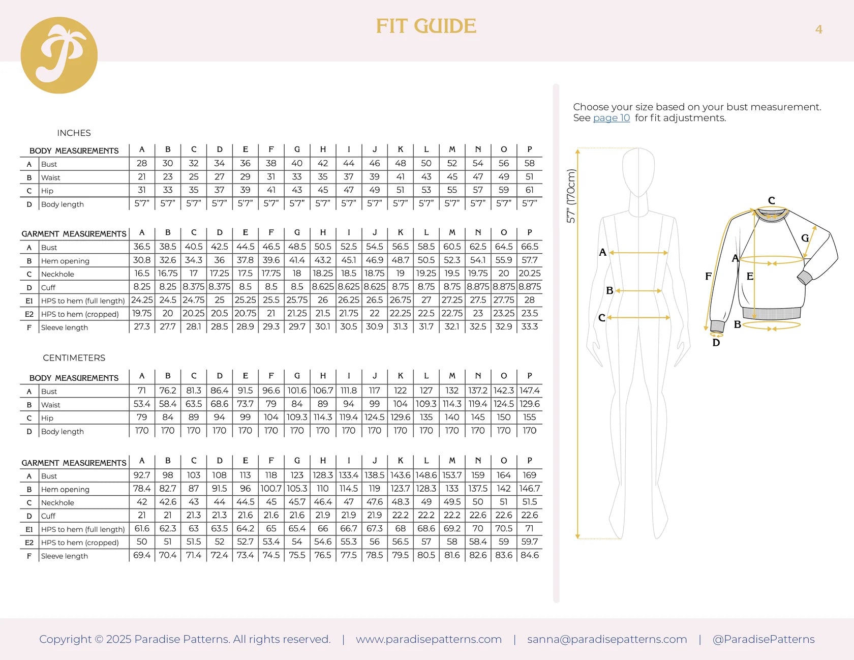 The pattern is best suited for sweatshirt knits such as French terry and fleece, but you may also use a waffle knit or heavy weight jersey. If you choose to use the same fabric for the main body and the edges, the fabric needs to have at least 50% crossgrain stretch and 3% elastane (or more). If you’re using a rib knit in the neckband, waistband, and cuffs, the main fabric doesn’t need stretch. The rib knit should have at least 3% spandex. Page 7 gives you the fabric requirement for both options.