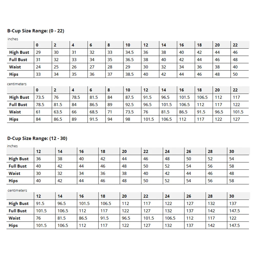 This pattern includes two size options. There is a B-cup pattern from sizes 0-22 and a D-cup pattern from sizes 12-30.