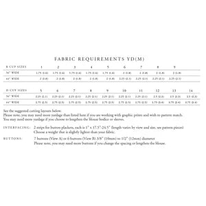 The Nepheline Blouse is available in 2 size ranges: B cup (full bust 32” to 48”) and D cup (full bust 42” to 60”).