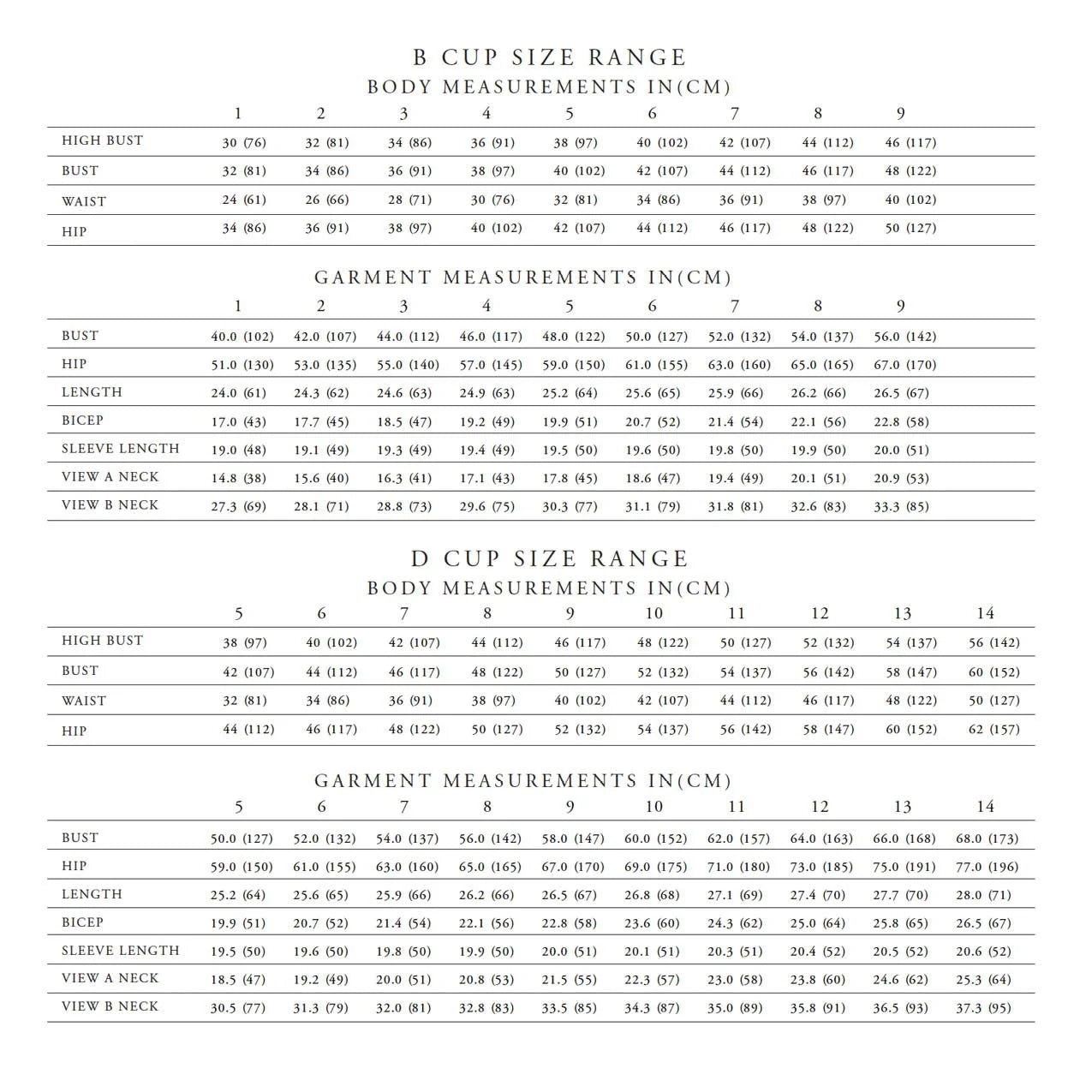 B cup indicates a difference of 2” between the high bust and full bust. D cup indicates a difference of 4” between the high bust and full bust. The sizes between B and D cup patterns are consistent for the shoulders and upper bust. The full bust is what differs between the two size ranges. This is done so that the ease is consistent whether you are a B cup or D cup if you choose your size according to the instructions.
