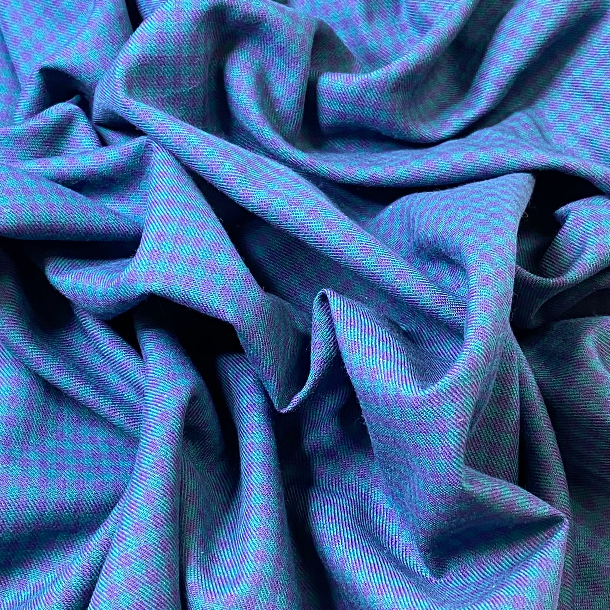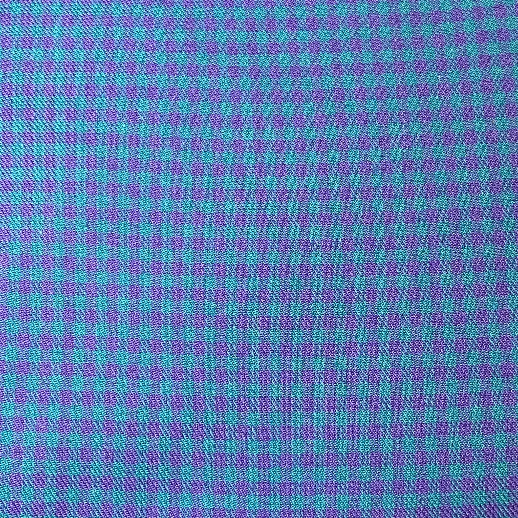 This fabric is a light-to-mediumweight cotton and polyester blend featuring a fine yarn dyed micro check pattern in cool tones of teal and purple. The tight, even weave gives the cloth a smooth surface with subtle visual texture and excellent durability.