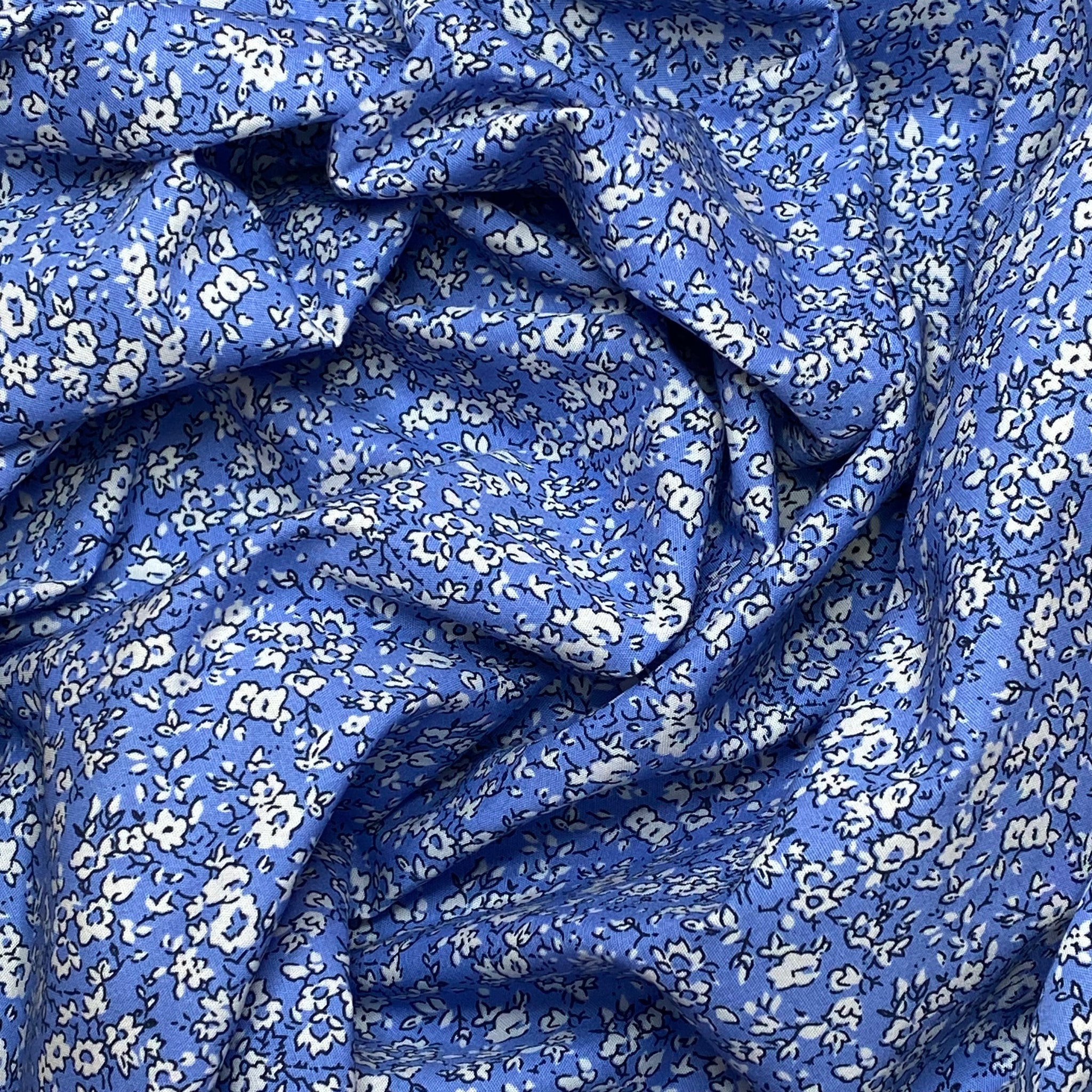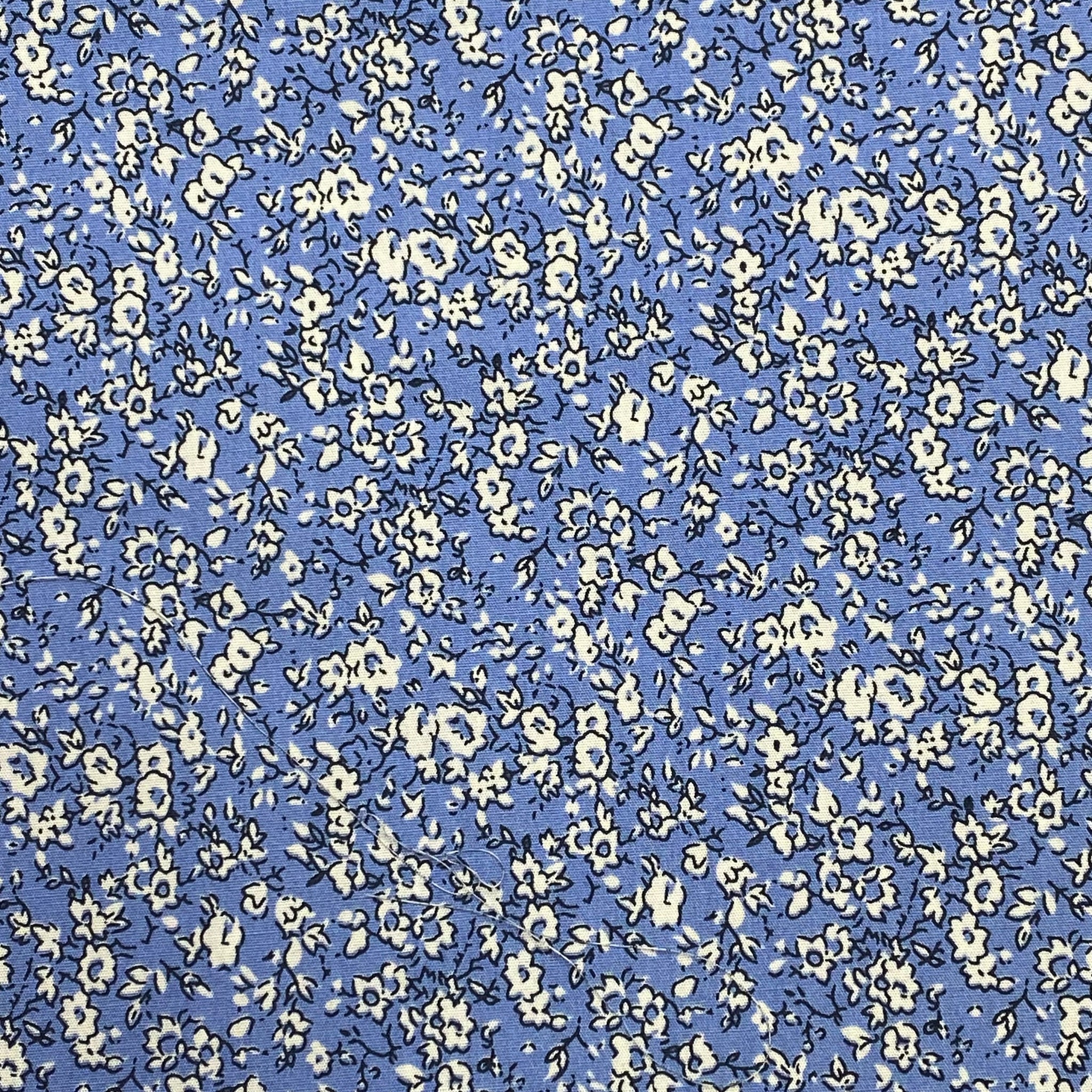 Lightweight cotton broadcloth with a vintage-style ditsy floral across a periwinkle blue background. Smooth, tightly woven hand with excellent durability for its weight. Soft drape, cool and breathable, presses cleanly for a crisp finish.