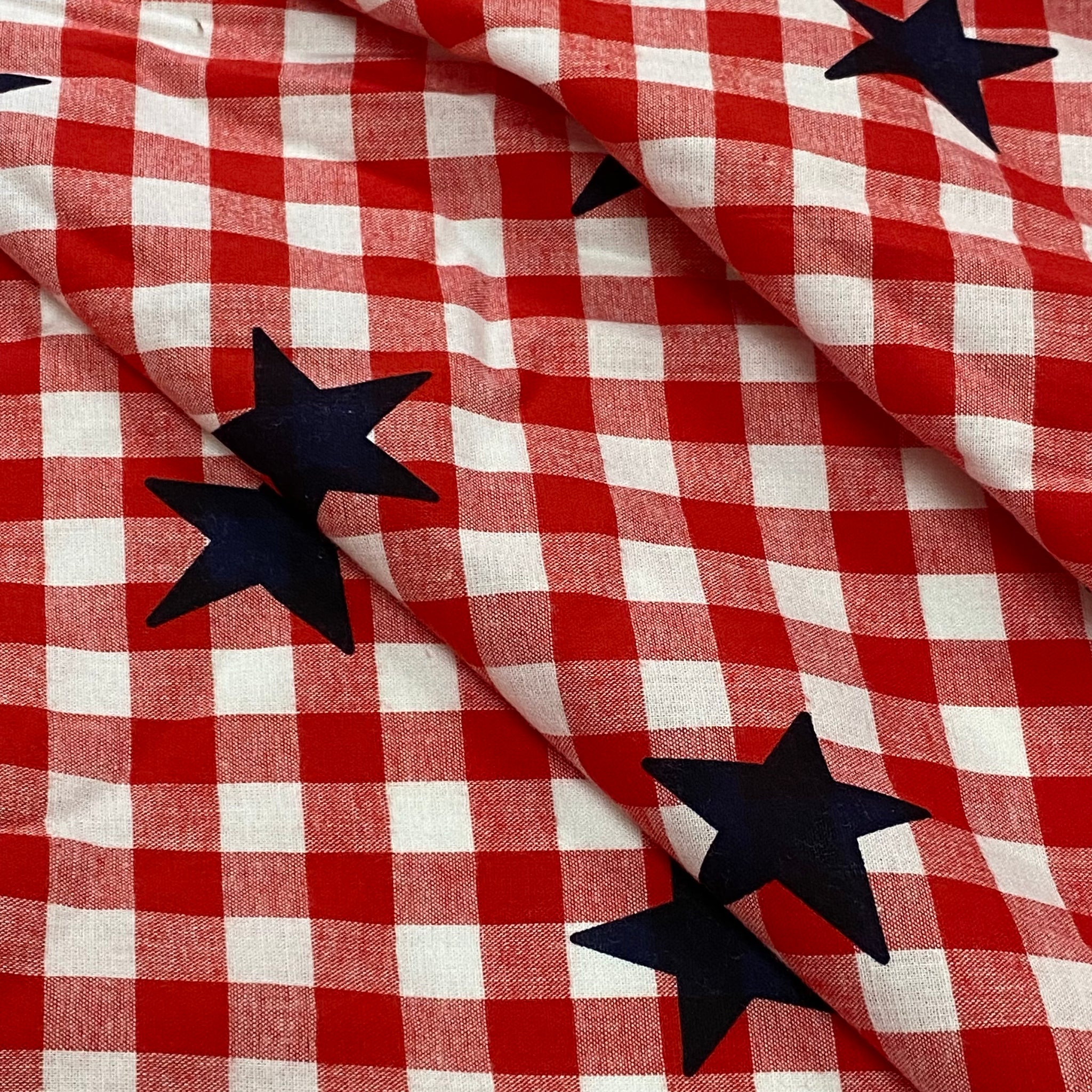 Lightweight 100% cotton woven with a red and white gingham check, overlaid with bold navy stars, a playful twist on a vintage picnic inspired classic.