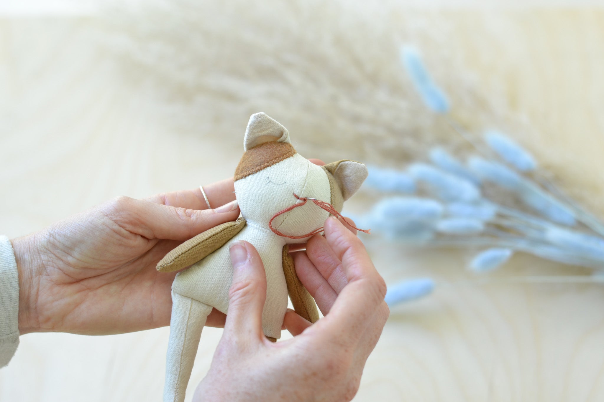 Make your own Mes petites lunes mini cat doll with this easy step-by-step tutorial and professional sewing pattern. With this bundle, you'll be able to make a 6 in (15 cm) mini cat plush with two different outfits: a raglan dress and a jumpsuit, and also a bow for a more feminine look.